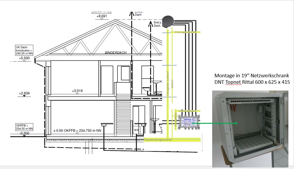Wir werden voraussichtlich mit 12 kWp die 3 Dachflächen gut ausnutzen. SAT-Dachziegel wird vom GU bereitgestellt. Außerdem werden die Leitungen vom DG in den Technikraum gezogen und die Erdung vorbereitet. Durch uns sind alle Komponenten (Schüssel mit QUAD-LNB, Halterung, Verteiler für unsere insgesamt 8 TV-Dosen im Haus etc.)