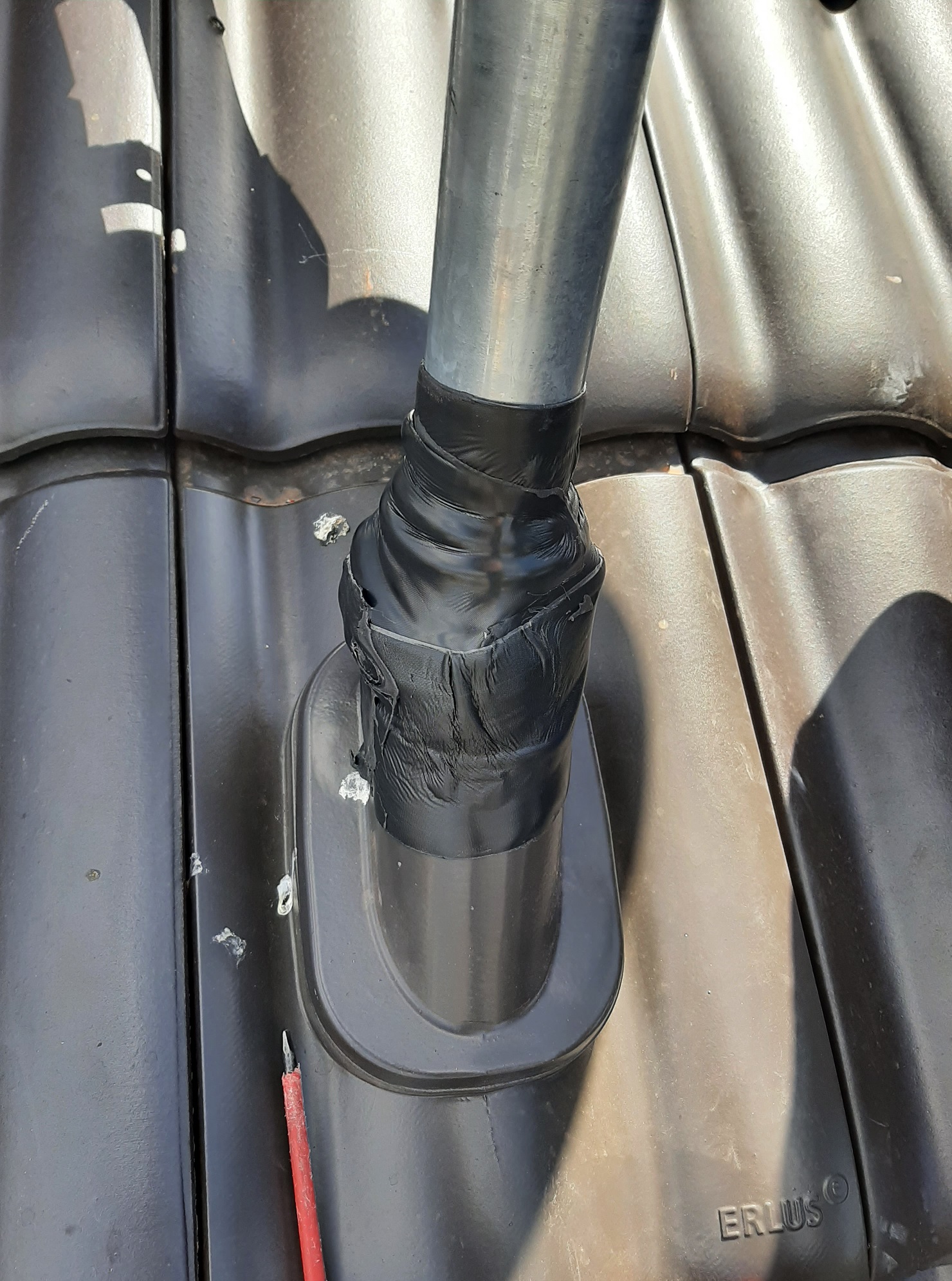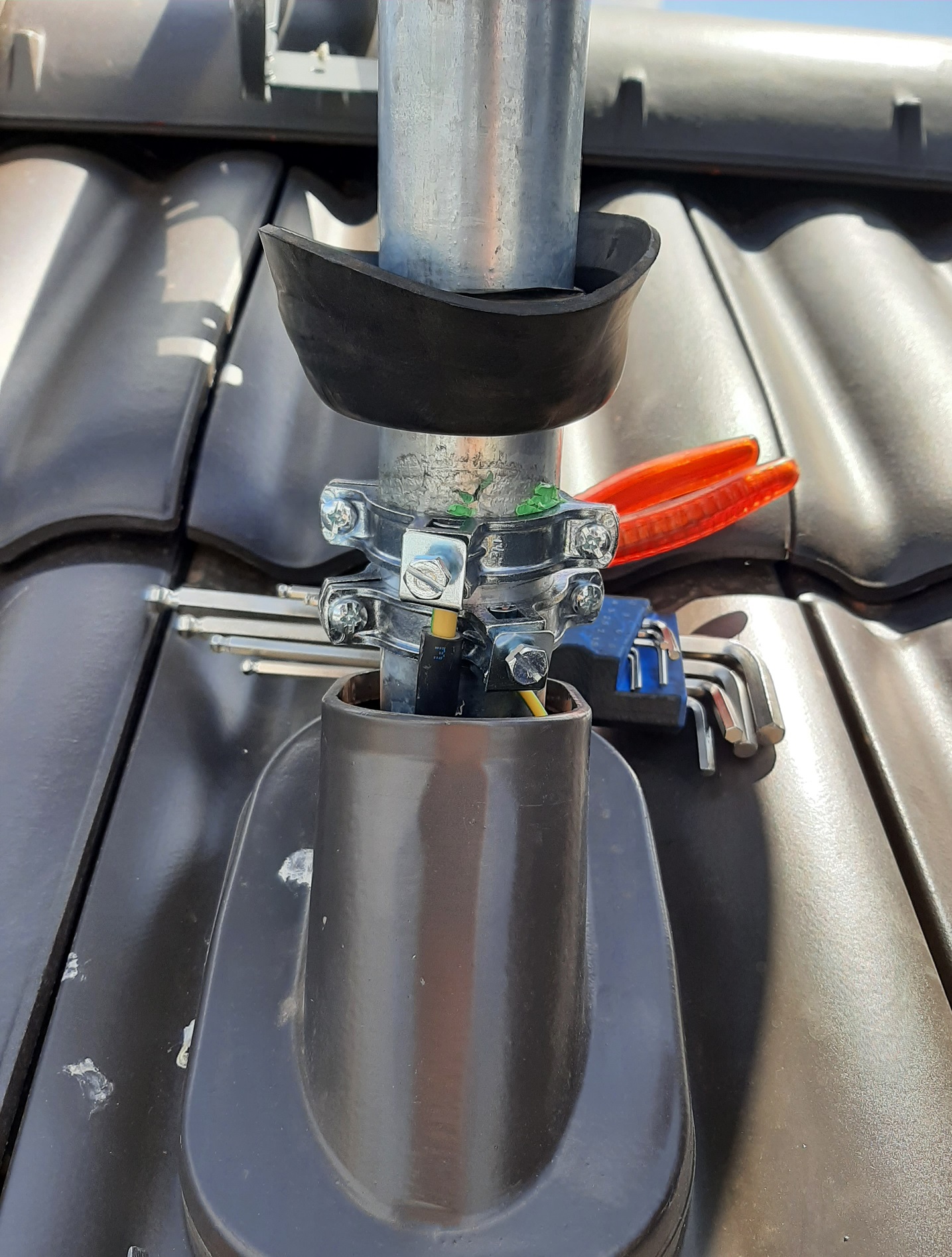 Anbei ein Fotos von der Installation. 'Problematisch' war die Durchgangsziegel welche nicht viel Platz nach oben geboten hat - mit den Schellen ganz unten ging die Ziegel gar nicht mehr vollständig drauf ... haben daher einfach die Schellen über die Durchgangsziegel gepackt und dann mit der Gummidichtung und der Abschweißbahn abgedichtet.