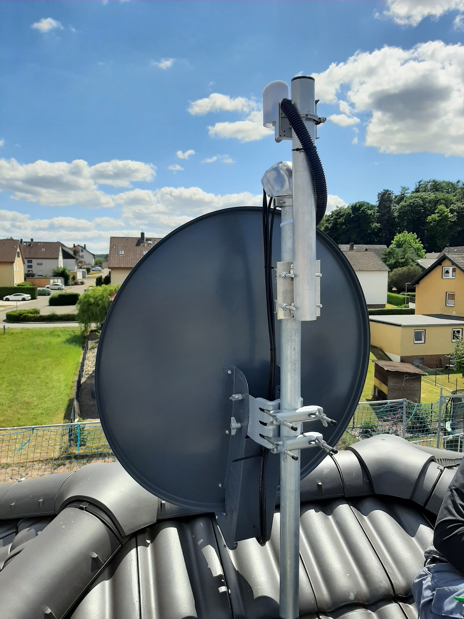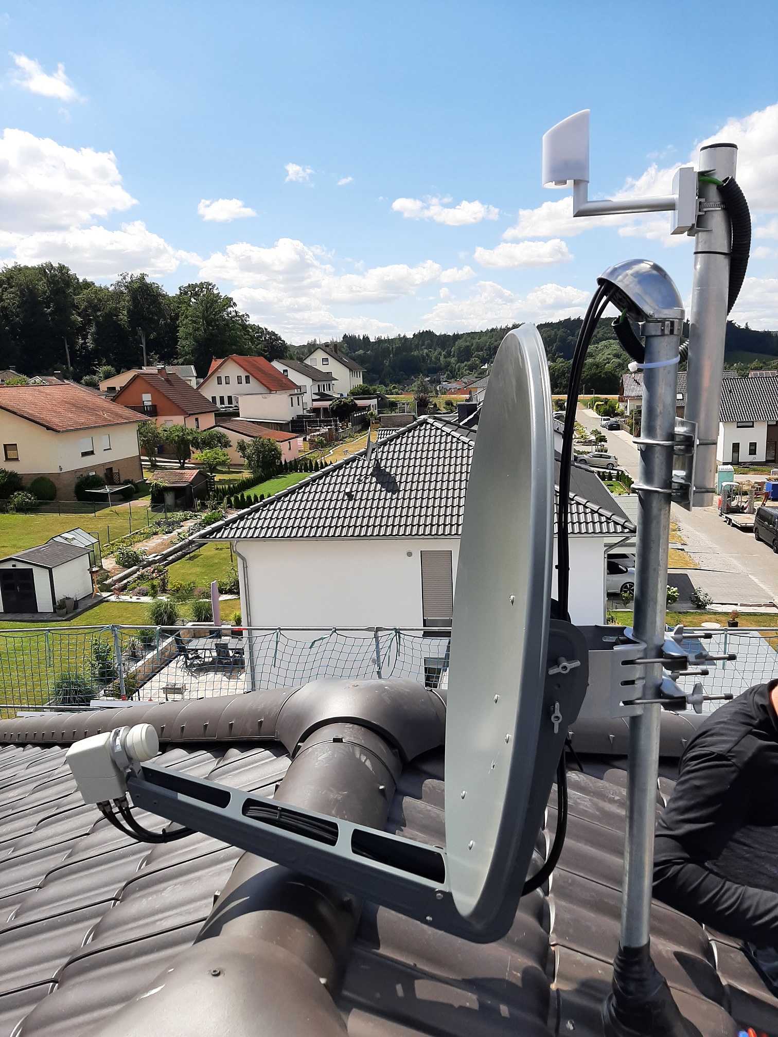 Wenn es keine Bedenken gegen die Umsetzung gibt, würde ich mich anschließend mit der detaillierten Planung und der Erstellung des Warenkorbes beschäftigen. Alternativ zur Befestigung auf dem Dach wäre noch eine Wandmontage denkbar, welche ich aber vorbereiten lassen müsste und dafür 'bald ankündigen müsste'. Ich habe auch überlegt die Schüssel auf die Garage zu setzen, aber leider hat man von dort aus keine freie Sicht.