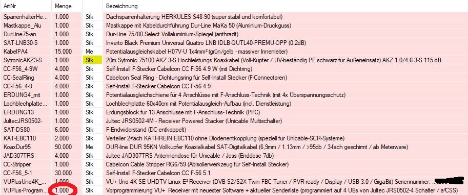 1. fehlt das UV-beständige Koaxkabel vom Quattro-LNB bis zum Mast-nahen Potentialausgleich ! Das ist in ihrem Referenz-Beitrag jetzt auch mit drin, wurde ergänzt mit den neuen Angaben/Gegebenheiten die jetzt dort rein kamen ... aber auch im Beitrag unter Planung Einkabellösung der ihrem Anliegen/ihrer Planung auch sehr gut entspricht und sogar aufzeigt wie sie ihre Anlage auch mit einer Breitband-LNB Versorgung aufbauen könnten (2 Kabel pro Satellit nur notwendig).