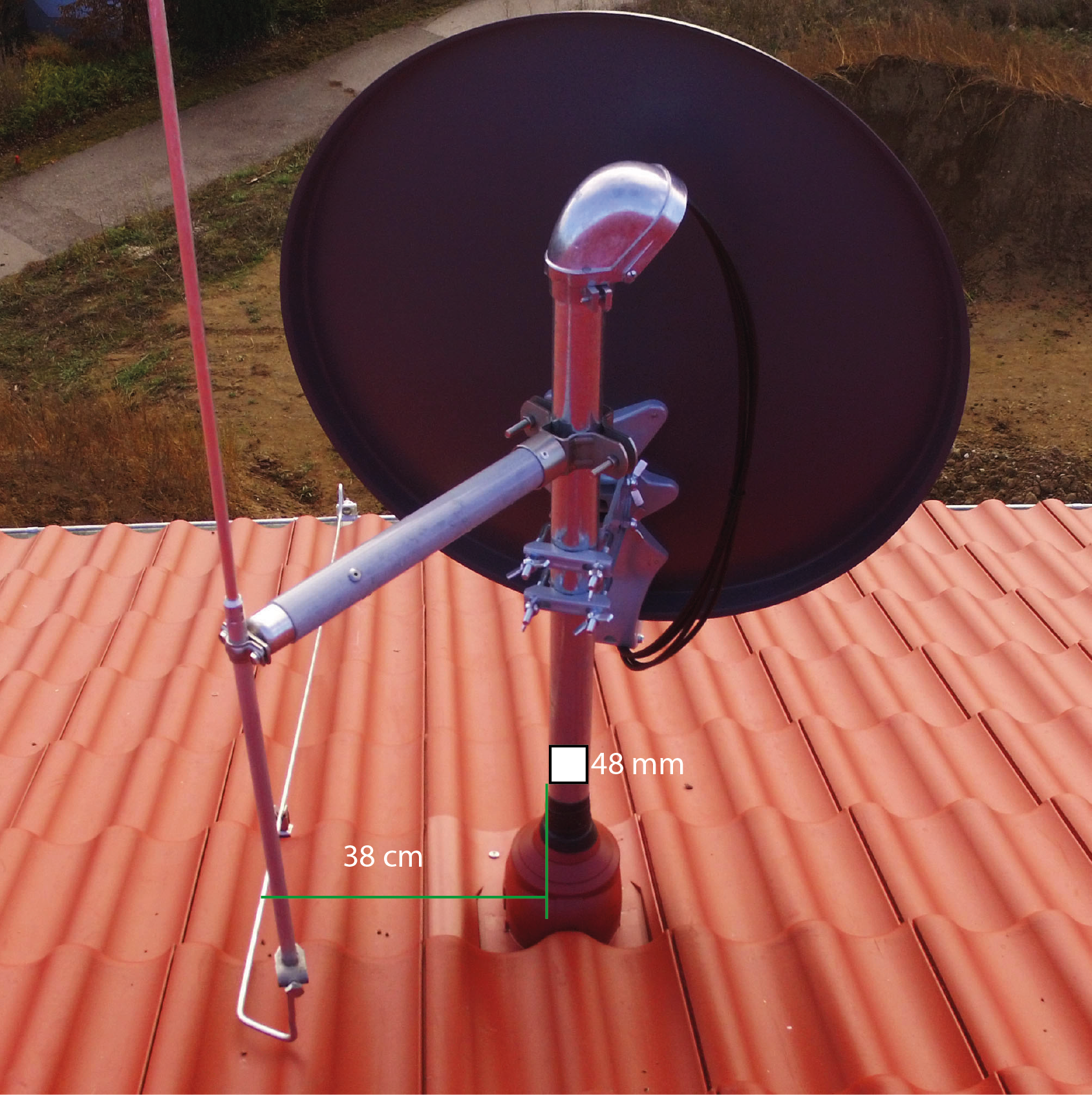 gerade mal eine Plattenbreite wäre selbst bei einem klassischen Antennenmast zu wenig Trennungsabstand. Je nachdem wie mittig oder unsymmetrisch das Rohr von einem Dachsparrenhalter auf dem Querträger angeordnet wurde, verringert sich der Abstand zusätzlich.