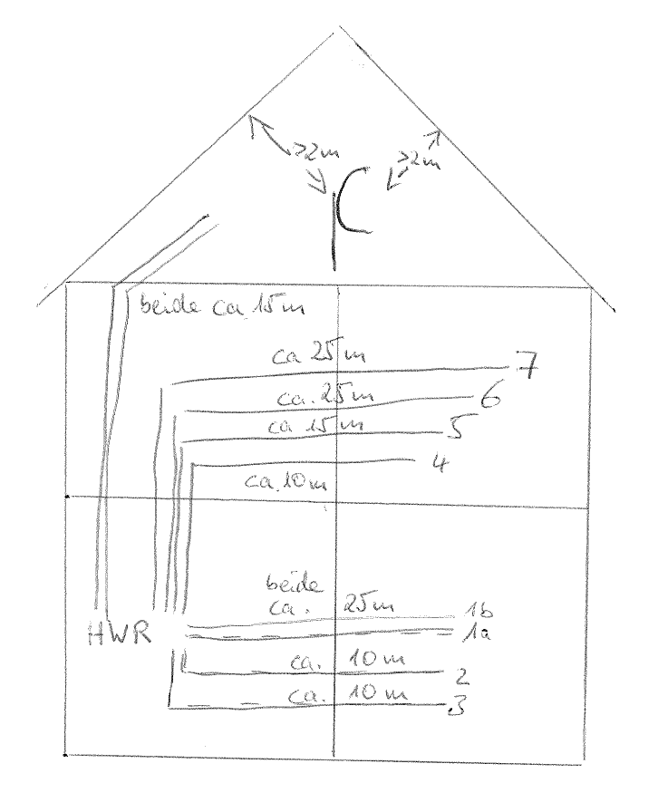 - Aus dem Spitzboden (von dem ohne Probleme eine Schüssel zu erreichen wäre) laufen leider nur zwei Leitungen in den HWR (Länge jeweils ca. 15m)