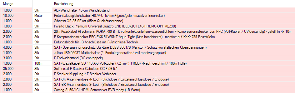 Bevor ich den Warenkorb aber abschicke, würde ich gerne wissen, ob ich einen Denkfehler gemacht habe, bzw. ob die Komponentenwahl glücklich von mir getroffen wurde (meine Erfahrung mit Satanlagen stammen noch aus der Analog-Sat-Zeit