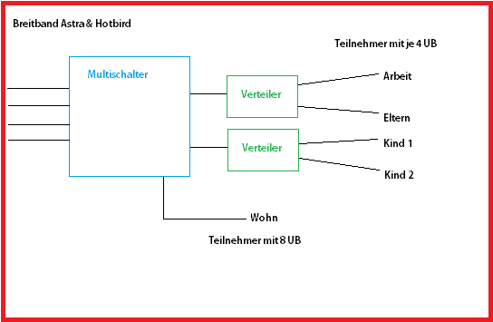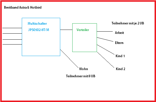 Unicable 2 LNB im EFH (Einkabellösung) (gleicher Multischalter, gleiche Breitband-LNB Versorgung - nur das der 4-fach Verteiler hier fehlt)