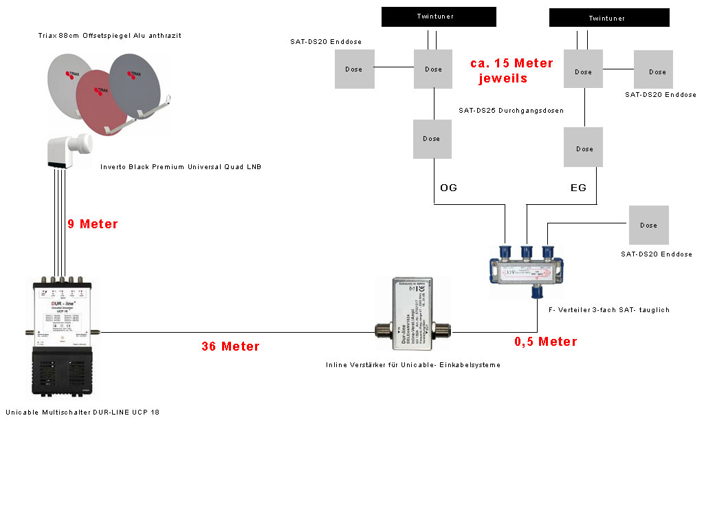nachdem es sich doch länger hingezogen hat, ist nun endlich alles fertig und Dank Ihrer schnellen Lieferung ging es zum Schluss sehr fix und es funktioniert. Drei Änderungen haben sich ergeben zu meiner Anfangs eingestellen Zeichnung. Erstens haben wir den Multischalter von Inverto genommen (den 111) und zweitens den Verstärker weggelassen und es kommt überall ein stabiles Signal an. Und den UKW Ringdipol haben wir noch angebracht um Radio einzuspeisen.