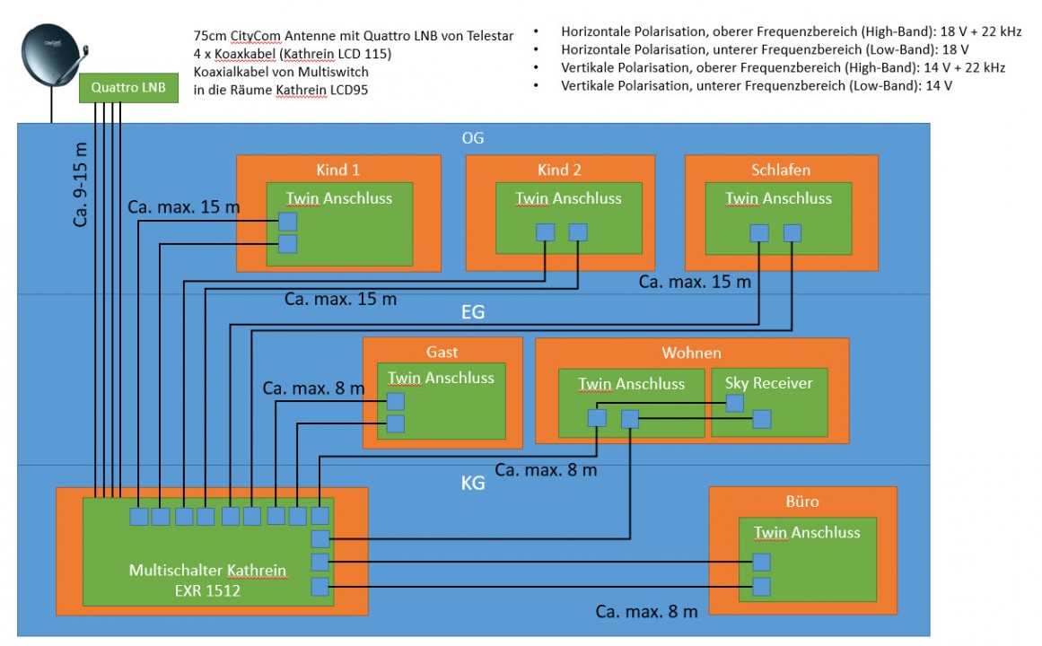Auf dem Dach ist eine 75cm CityCom Antenne mit einem Quattro LNB von Telestar installiert. Von dort gehen 4 Koaxkabel (Kathrein LCD115) in den Keller in den Technikraum auf den Multischalter EXR1512 von Kathrein. Von dort gehen in Büro (Kellergeschoss), Wohnen und Gast (Erdgeschoss) sowie in Kind1, Kind2 und Schlafen (Obergeschoss) je 2 Koaxkabel (LCD95 von Kathrein) in die einzelnen Räume mit jeweils 2 Satdosen (ich gehe davon aus, dass es Stichdosen sind). Meine Überlegung war damals das man immer noch einen Sender aufnehmen kann, wenn man parallel etwas schaut. Leider kannte ich damals JESS/Unicable noch nicht, sonst hätte ich das gleich so verlegen lassen. Soweit die Ist-Situation.