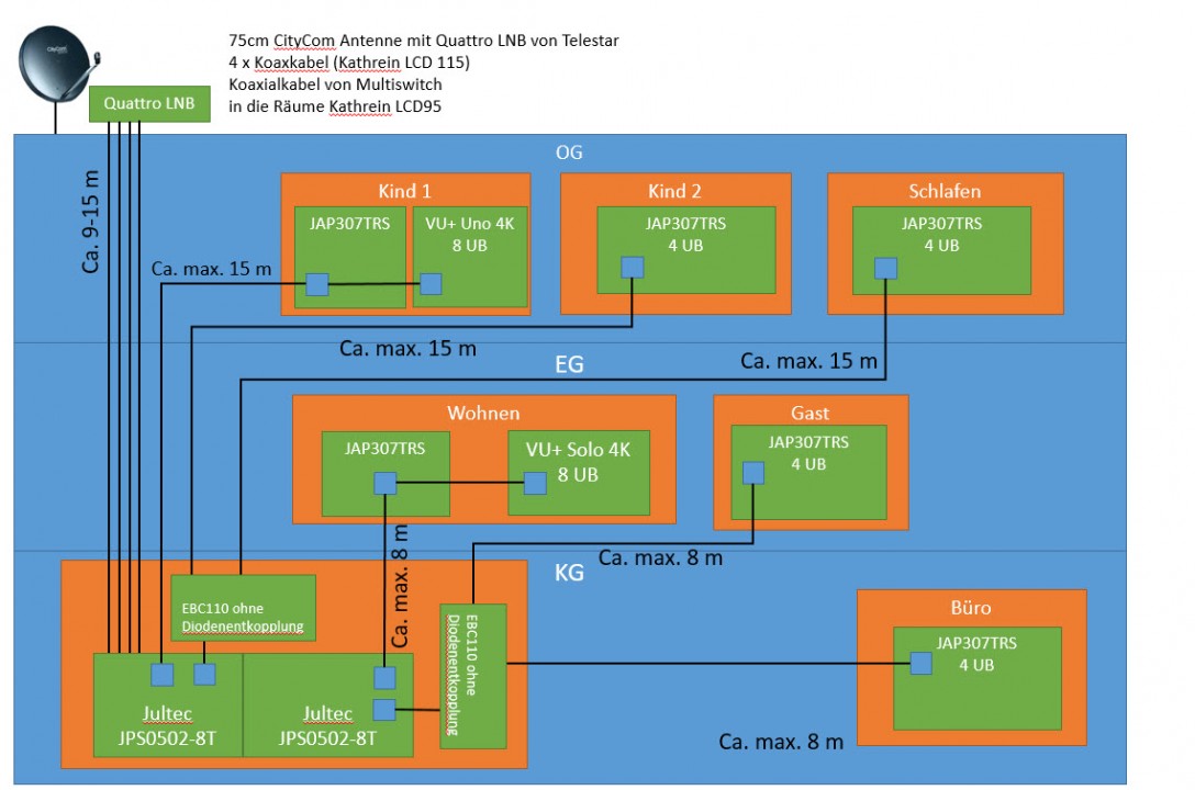 Wenn ich später andere Räume hinzufügen möchte, dann würde ich einfach einen weiteren Jultec JPS0502-8M oder einen Jultec JPS0501-16TN hinzufügen. Hier ist mir noch unklar wieviel Multischalter kann man den kaskadieren? Nur für den Fall das 32 UB nicht ausreichen sollten.
