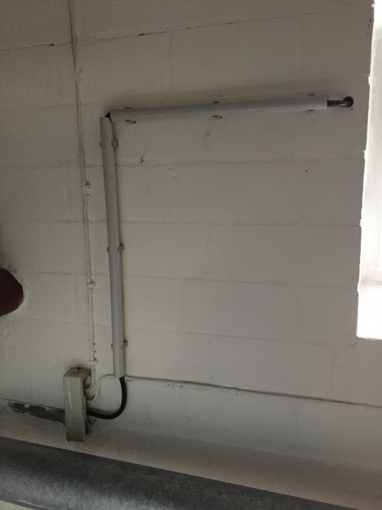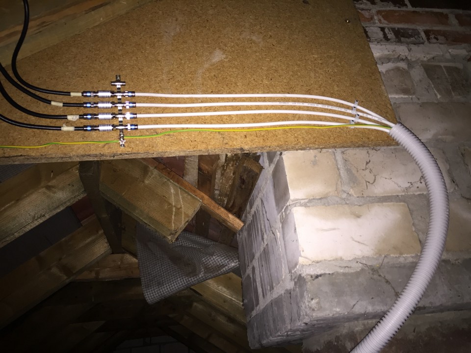 Als erstes haben wir das Erdungskabel verlegt. Abends zuvor noch schnell in den Baumarkt und Leerrohre geholt und los ging's. Bohrung im Keller, Halterungen für die Leerrohre gesetzt, diese zugeschnitten, Kabel eingezogen und dann das Kabel bis an die designierte Stelle der Antenne gelegt.