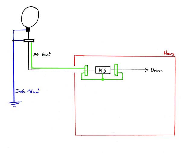 30m 16mm² kabel. Kabel wird aussen am Haus nach unten geführt, dann in den Keller und auf die Erdungsschiene geklemmt. Durch das Leerrohr kriege ich das leider nicht durch.