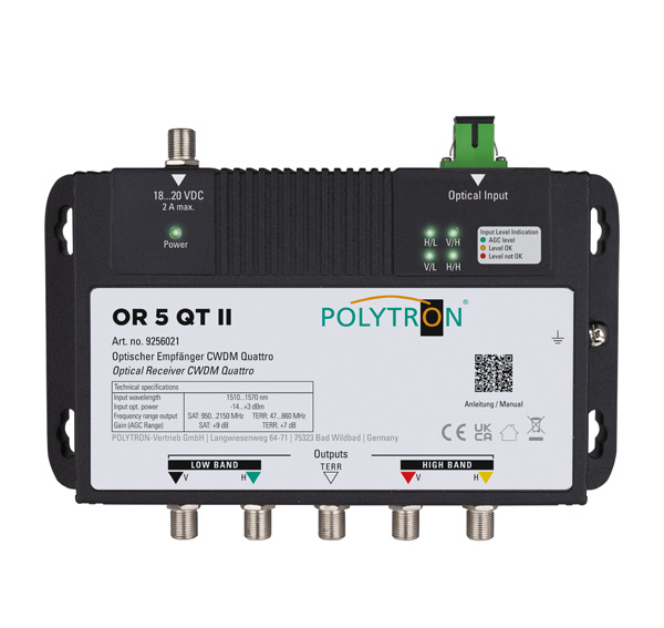 Die optischen Receiver OR 5 QT II und OR 4 S II dienen der Rückumsetzung des optischen Signals in die SAT- und das terrestrische Signal im HF-Bereich.