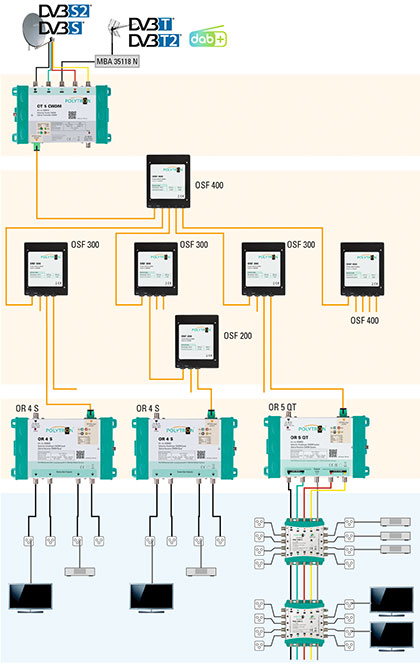 Zusätzlich können DVB-T/T2 und DAB+ Signale verteilt werden. Die Rückumwandlung der Signale erfolgt mit dem OR 5 QT bzw. dem OR 4 S.