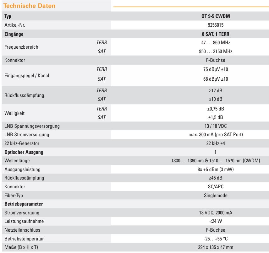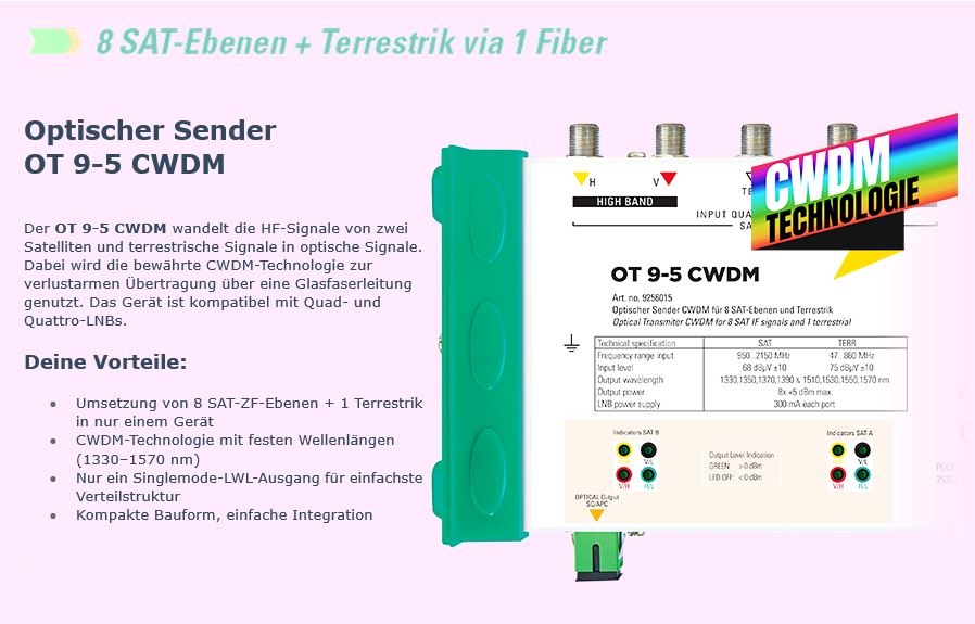 Der optische Transmitter OT 5-5 CWDM dient dem Empfang von 4 SAT-Eingangssignalen und terrestrischen Signalen und deren Umsetzung in ein optisches Signal. Dabei werden die Eingangssignale getrennten Wellenlängen im Bereich 1510 … 1570 nm zugeordnet.