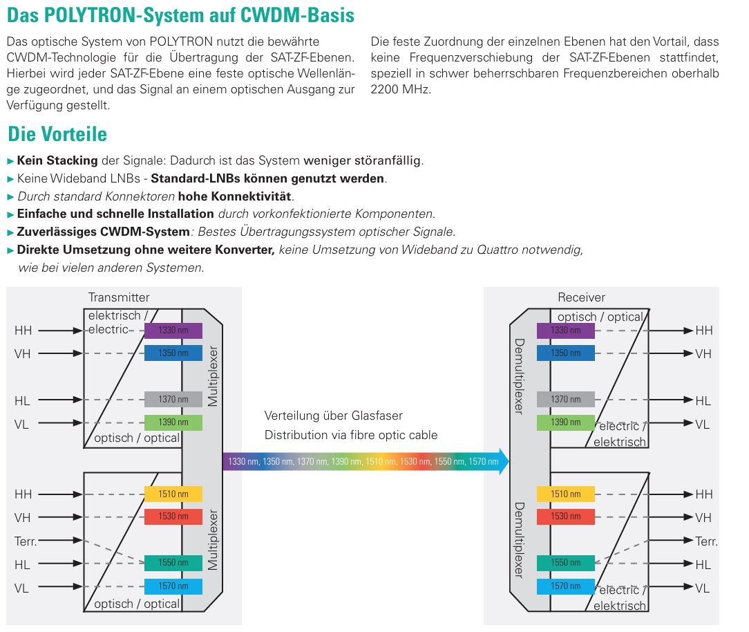 Das optische System von POLYTRON nutzt die bewährte CWDM-Technologie für die Übertragung der SAT-ZF-Ebenen. Hierbei wird jeder SAT-ZF-Ebene eine feste optische Wellenlänge zugeordnet, und das Signal an einem optischen Ausgang zur Verfügung gestellt.