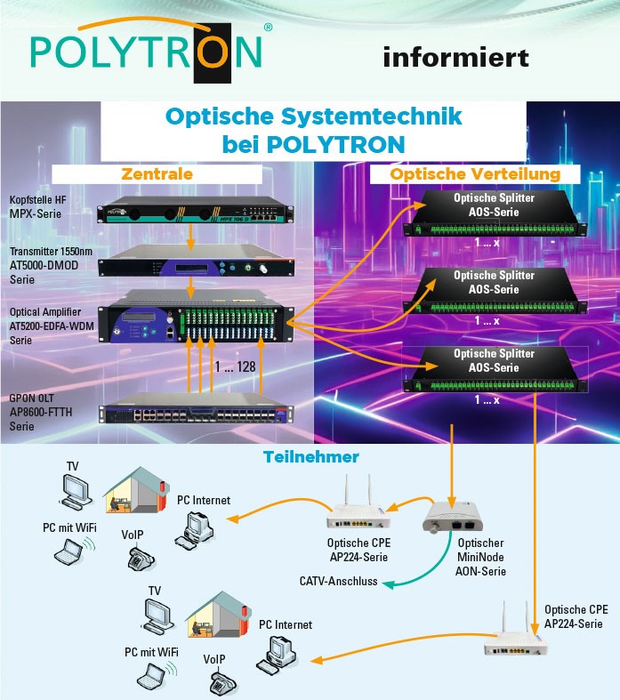 Optische Systemtechnik bei POLYTRON - 1550-nm-Sender, optische Multiport-Verstärker mit WDM, optische Verteiler und CPEs