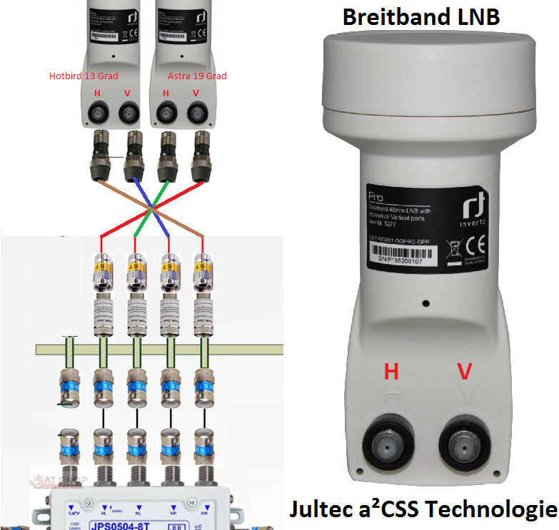 Empfehlen würde ich, steht auch im Beitrag für die Sat-Ausrichtung, hierfür erst einmal einen Single-LNB zu verwenden (erst ein Satellit, Astra, und dann den 2. nebendran .. bei Astra + Hotbird geht das einfach weil da kein großer Abstand ist). Wenn der dann richtig ausgerichtet ist einfach den Single-LNB durch den Breitband-LNB austauschen (und ggf. Messgerät nochmal anschließen und zu 100% genau, da geht es um weniger als Millimeter, versuchen nachzujustieren.