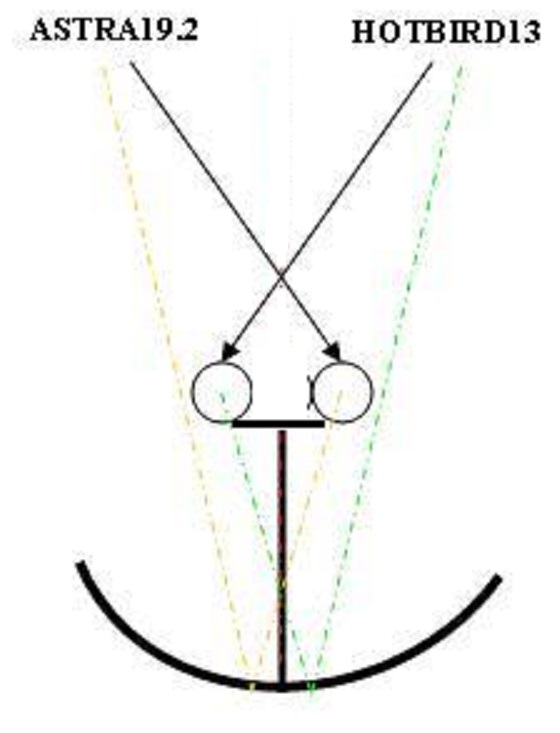 und die Anordnung der LNB's, hier macht es doch Sinn den, ich nenne Ihn mal Astra-LNB links und den Hotbird-LNB rechts auf der Multifeedschine zu befestigen, siehe Bild Satbeam-App:
