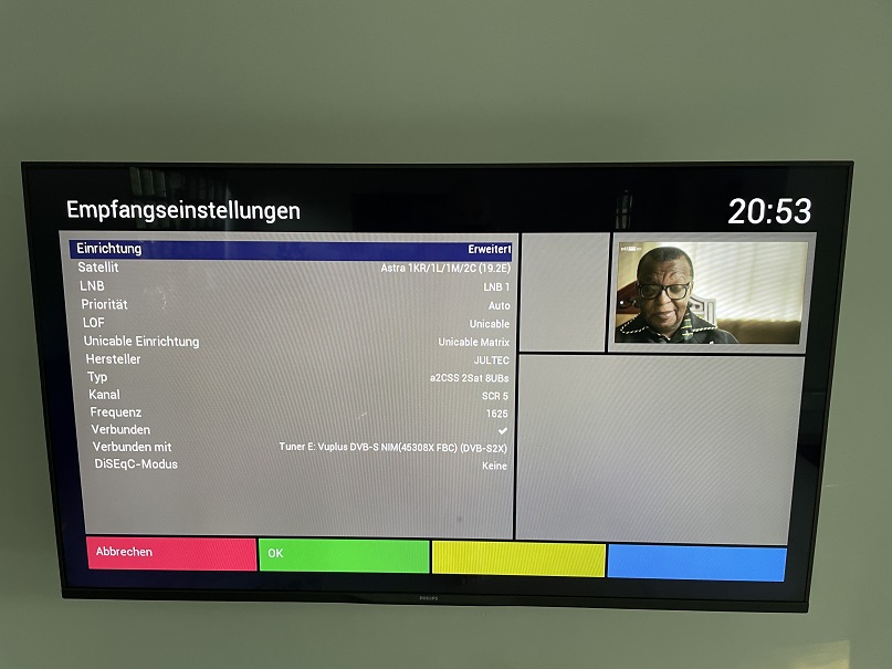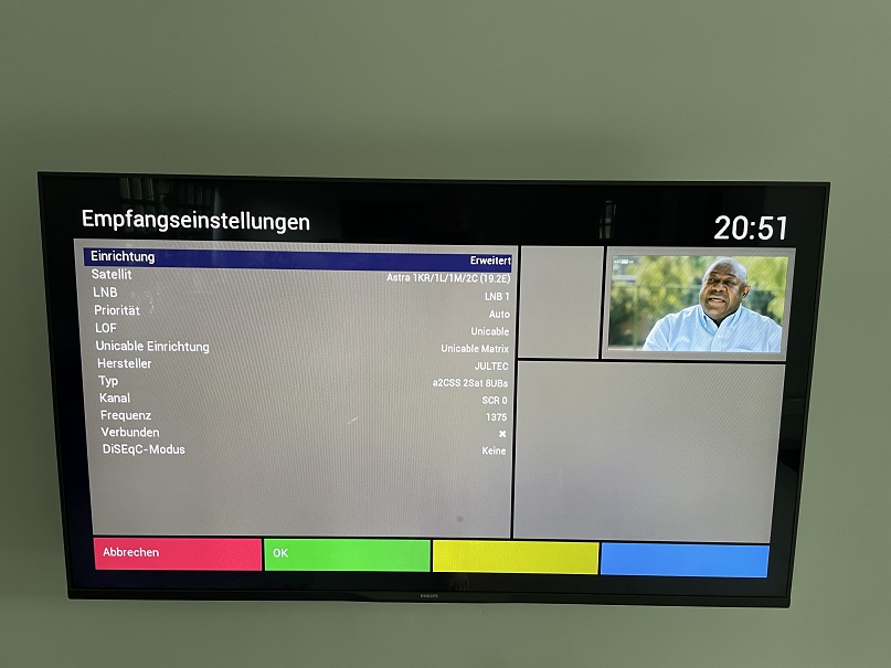 guba hat geschrieben: 1. Juni 2021 00:22Die Standbilder ZDF (wohl das zuletzt gesehene Programm vor dem Umschalten) mit dem gewählten Programm CGTN auf Hotbird zeigt mir, dass vermutlich das LNB für Hotbird nicht oder nicht richtig programmiert ist (Bild hier reinstellen). Signalstärke ist 0%