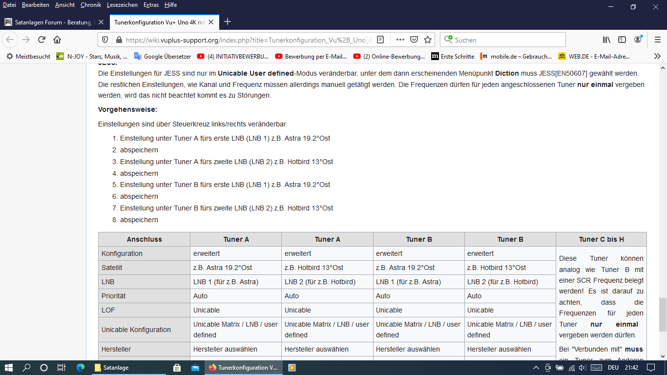 techno-com hat geschrieben: 26. Mai 2021 10:56Hier aus dem VU+ Wiki die Tuner-Einstellungen für die Uno 4K SE => KLICK (dort Punkt 8 => Unicable / JESS für zwei Satpositionen)