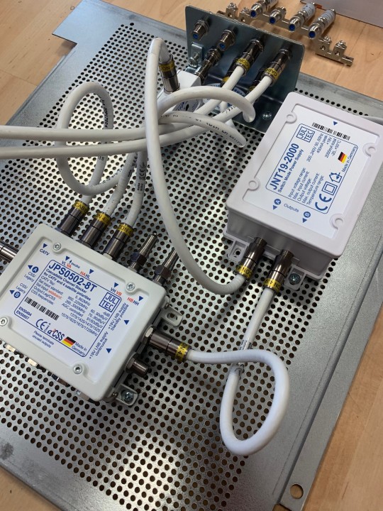 Unten rund um den Multischalter wird dann über die Self-Install Stecker gearbeitet welche man auch am Mast-nahen Potentialausgleich einsetzen kann ... also davon dann 6 Stück mehr (Eingang 4er Erdungsblock/ "Ende" vom UV-beständigen Koaxkabel)