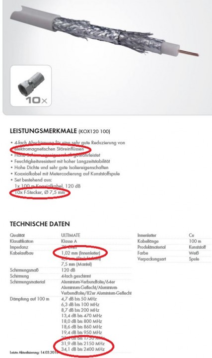 Die "Abschirmung" von einem Koaxkabel ist gerne mal hergenommen weil da alle drauf fliegen, das ist doch aber das unnötigste was es überhaupt sein muss (siehe hier erklärt). Und dann ist ja der Hammer das diese 20 Standard F-Stecker mit dabei sind bei dem 120db Koaxkabel in der Abschirmung :1128 die machen doch die ganze Abschirmung wieder kaputt.