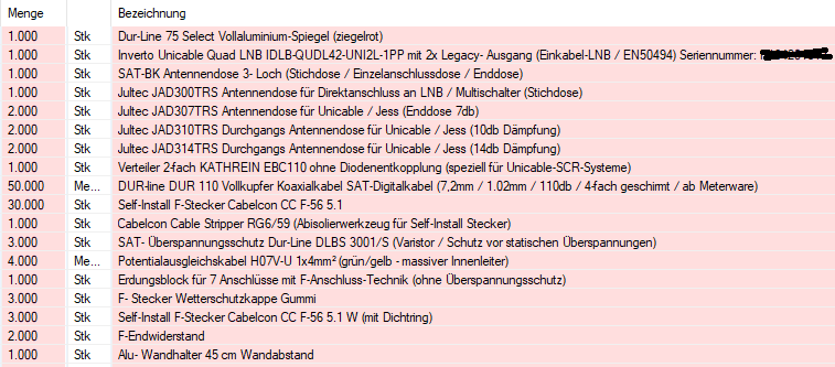 Ich wollte in Ihrem Shop eine DUR-Line 75/80 SAT-Schüssel bestellen, sowie die relevanten Komponenten wie LNB, Verteiler, Erdungsblock, Dosen, Kabel und F-Stecker, usw., die ich mit Ihrer Hilfe auch richtig bestellen möchte.