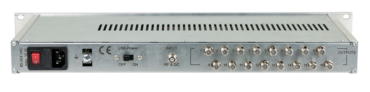 Aktiver SAT / L-Band Verteiler mit 1x HF-Eingang und 16 HF-Ausgängen im Frequenzbereich von 950 – 2150 MHz. Ein eingespeistes Sat-Signal steht an 16 Ausgängen verlustfrei zur Verfügung, die Verteildämpfung wird hierbei ausgeglichen.