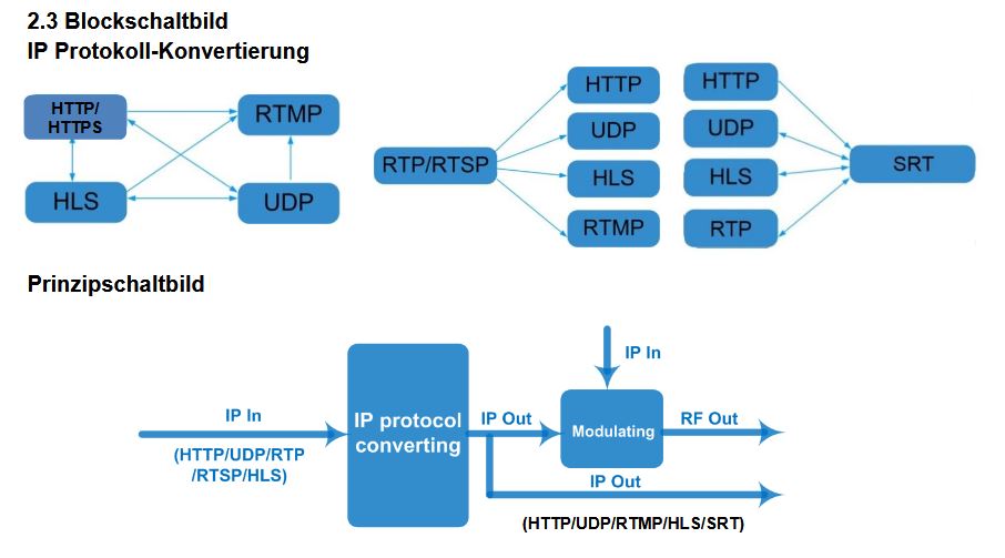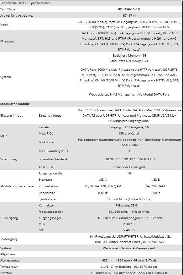 Der HDI 256-16 C II IPTV-Modulator ist ein hochintegriertes Gerät, welches zwei völlig unabhängige Module beinhaltet. Ein IPTV-Gateway-Modul, welches für Protokollkonvertierungs- und Streaming-Media Anwendungen genutzt wird und den IP-Stream von HTTP, HTTPS, UDP, RTP, RTSP, SRT, HLS und TS-Files in HTTP, UDP, SRT, HLS und RTMP Protokolle konvertiert.
