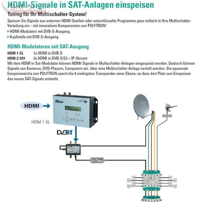 Das Erzeugen von eigenen Satelliten-Signalen war bisher nur mit sehr aufwendigem teurem Equipment möglich. Dies erschwerte es, eigene Inhalte, beispielsweise mit Informationen für Hausbewohner oder Patienten in Krankenhäusern und Altenheimen, in denen eine SAT-Infrastruktur genutzt wird, rentabel zu verteilen. Der HDM 1 S von POLYTRON macht dies möglich. Das kompakte Gerät erlaubt es, ein HDMI-Signal in DVB-S zu modulieren und in eine bestehende SAT-ZF-Hausverteilung einzuspeisen. Somit ist der Empfang der gesamten SAT-Sendervielfalt inklusive eigenem Sendeinhalt mit nur einem DVB-S-Tuner möglich.