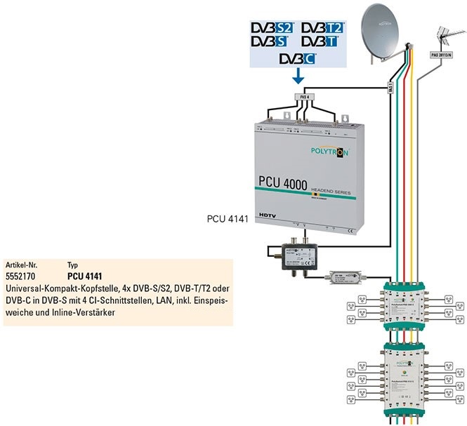 Kompakt-Kopfstelle PCU PolytronPCU4141_Beispiel_HDMI-DVB-S_Einspeisung4141 in DVB-S umwandeln und in die Multischalter-Anlage einspielen.