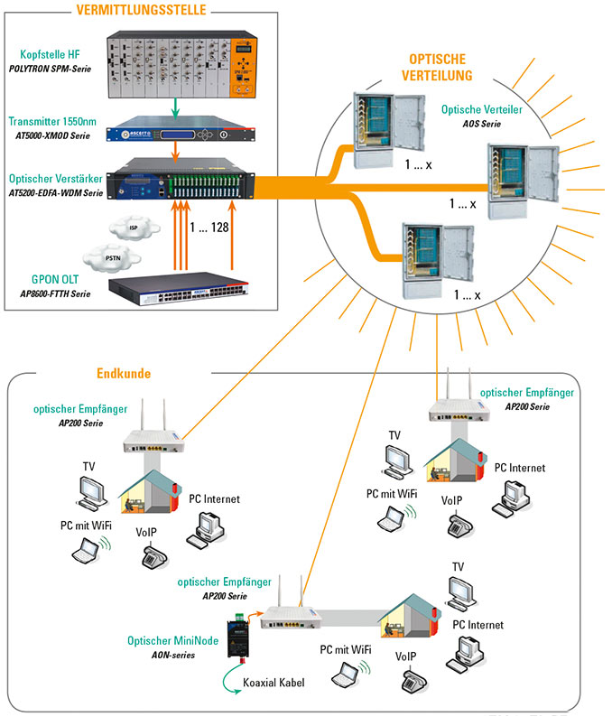 Optische Systemtechnik bei POLYTRON - 1550-nm-Sender, optische Multiport-Verstärker mit WDM, optische Verteiler und CPEs