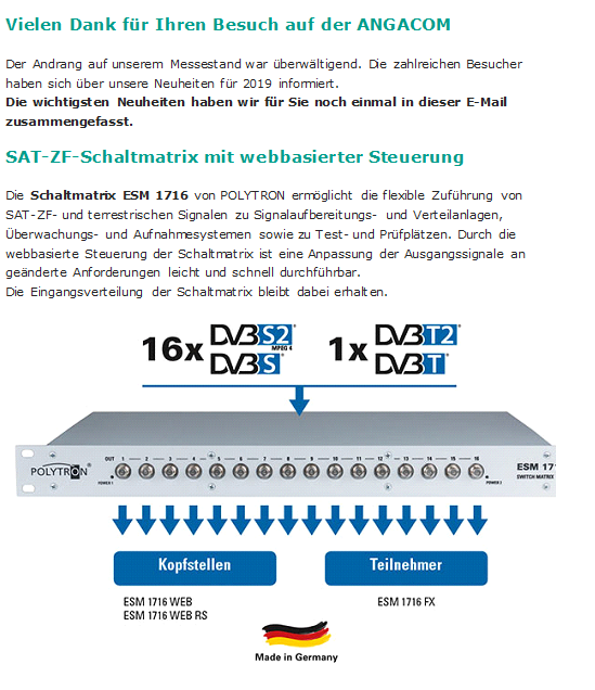 Die Schaltmatrix ESM 1716 von POLYTRON ermöglicht die flexible Zuführung von SAT-ZF- und terrestrischen Signalen zu Signalaufbereitungs- und Verteilanlagen, Überwachungs- und Aufnahmesystemen sowie zu Test- und Prüfplätzen. Durch die webbasierte Steuerung der Schaltmatrix ist eine Anpassung der Ausgangssignale an geänderte Anforderungen leicht und schnell durchführbar.