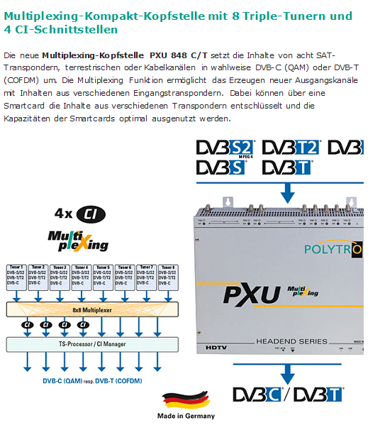 Die neue Multiplexing-Kopfstelle PXU 848 C/T setzt die Inhalte von acht SAT-Transpondern, terrestrischen oder Kabelkanälen in wahlweise DVB-C (QAM) oder DVB-T (COFDM) um. Die Multi¬plexing Funktion ermöglicht das Erzeugen neuer Ausgangskanäle mit Inhalten aus verschiedenen Eingangs-transpondern. Dabei können über eine Smartcard die Inhalte aus verschiedenen Transpondern entschlüsselt und die Kapazitäten der Smartcards optimal ausgenutzt werden.