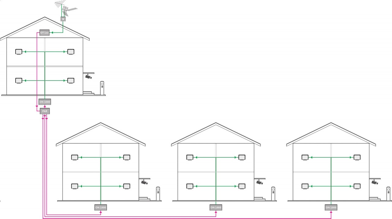 Der Sender OT 1xx DFB wandelt das digital terrestrische Signal in ein optisches Signal um, das über Single-Mode Glasfaserkabel und optische Verteiler / Abzweiger verteilt und dann vom Empfänger ON 1000 oder ON 1065 in ein elektrisches Signal umgewandelt wird, welche dann wieder in eine traditionelle Koaxverteilung eingespeist werden können.