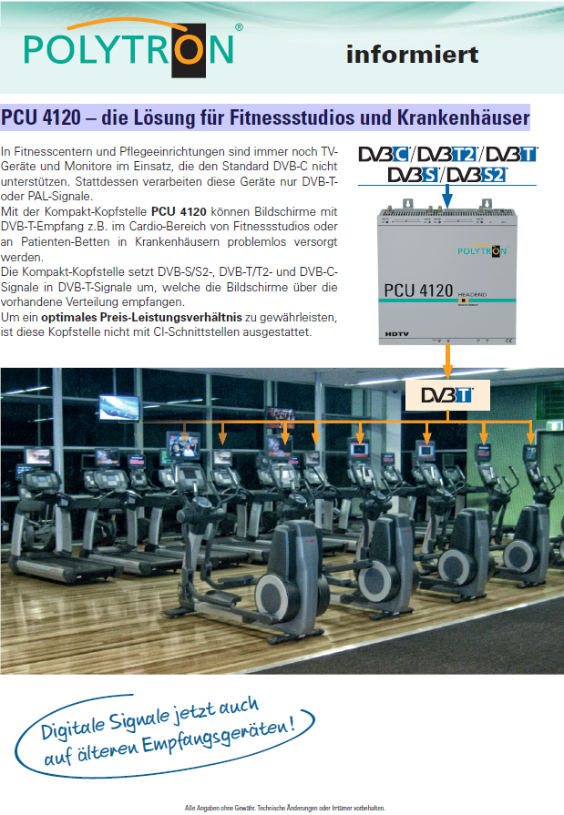 Mit der Kompakt-Kopfstelle PCU 4120 können Bildschirme mit DVB-T-Empfang z.B. im Cardio-Bereich von Fitnessstudios oder an Patienten-Betten in Krankenhäusern problemlos versorgt