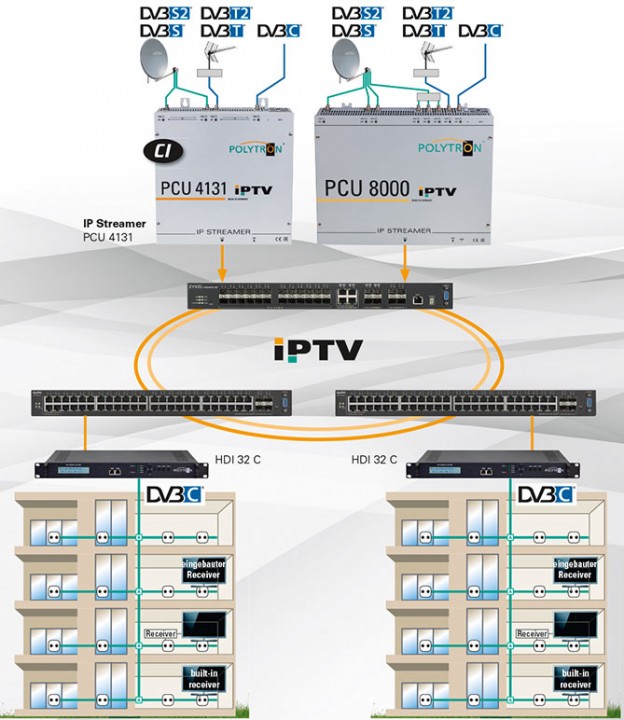 Die Übertragung von Fernsehprogrammen über digitale Datennetze (IPTV) genießt einen immer höheren Stellenwert. Die Kopfstelle PCU 4131 ("IP-Streamer") wandelt die empfangenen DVB-Signale in IPTV-Signale, welche im gesamten Netzwerk zur Verfügung gestellt werden können. Insbesondere in Bürogebäuden und Krankenhäusern stellt die Versorgung der Endgeräte über z. T. bereits vorhandene Netzwerkleitungen eine elegante Lösung für die zusätzliche Übertragung von Fernsehpro grammen dar. Bei Neubauten und Sonderanwendungen, wie bspw. auf Kreuzfahrtschiffen, überzeugt der Vorteil, dass lediglich ein IP-Netz aufgebaut werden muss und auf eine zusätzliche Koaxial-Verkabelung verzichtet werden kann. Die konstante Leistungsfähigkeit von IP-Netzen erlaubt zudem eine zuverlässige Anbindung mehrerer Gebäude.