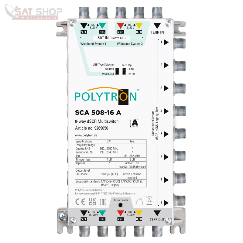Der Unicable-Multischalter SCA 508-16 A verfügt über 5 Eingänge (4x SAT, 1x Terr.), 5 Kaskaden-Ausgänge sowie 8 SCR/Legacy Ausgänge. Am Eingang können ein Quattro oder zwei Wideband LNBs (LOF: 10.41GHz) angeschlossen werden. Der terrestrische Zweig ist aktiv ausgeführt und kann auf einen Bypass-Mode umgeschaltet werden.