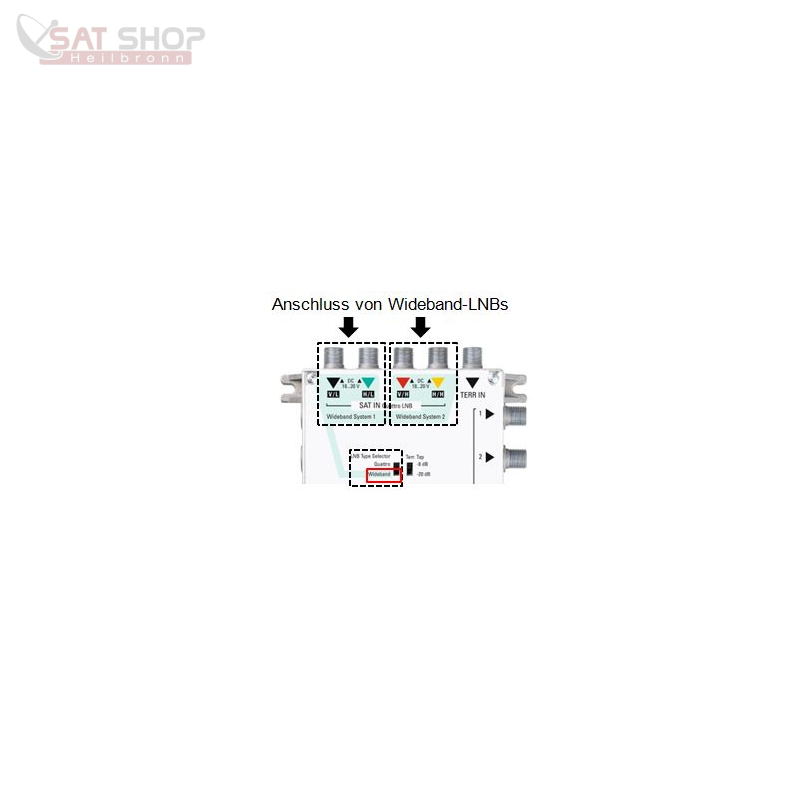 2x Wideband-LNB (LOF: 10.41 GHz) am Eingang (Schalterstellung „WIDEBAND“) - mir 1x Breitband-LNB geht auch ein Satellit, z.B. wenn nur 2 Koaxkabel vom LNB bis zum Multischalter verfügbar sind