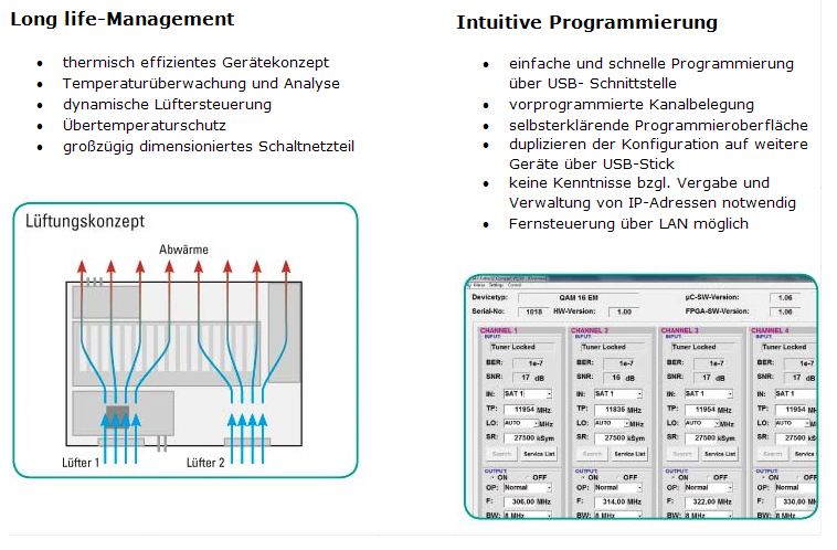 Polytron setzte beim Qam 16 nach eigenen Angaben auf ein thermisch effizientes Gerätekonzept, das Temperatur-Überwachung sowie -Analyse mit Übertemperaturschutz und dynamischer Lüftersteuerung bietet. Die Programmierung der Kopfstelle soll mit Hilfe einer selbsterklärenden Programmieroberfläche über eine USB-Schnittstelle von der Hand gehen. Laut Hersteller sind dafür keinerlei Kenntnisse bezüglich der Vergabe und Verwaltung von IP-Adressen erforderlich. Auch das Ausdrucken, Speichern und Duplizieren der Konfigurations-Daten wird mit einem USB-Stick möglich, über den sich auch eventuell benötigte Software-Updates aufspielen lassen. Die Fernsteuerung aller Parameter ist zudem über einen integrierten LAN-Anschluss möglich.