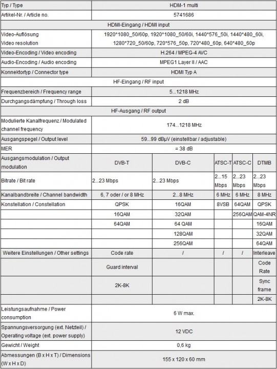 Der HDMI-Modulator arbeitet auf Basis des Standards MPEG-4 AVC/H 264. Das Ausgangssignal im Frequenzbereich zwischen 174-1218 MHz kann direkt in eine Koax-Verteilung einspeist werden, so dass alle TV-Geräte das Videosignal neben den schon vorhandenen TV-Programmen empfangen können. Die Modulationsfehlerrate (MER) ist mit ≥38dB hervorragend, der Ausgangspegel ist zwischen 59-99dBμV einstellbar.