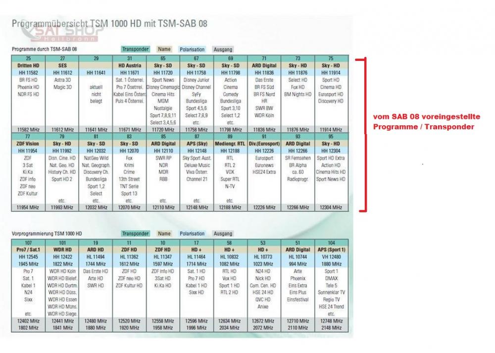 Das SAB-08 kitzelt schon ein paar Sender mehr raus (siehe Anlagen zuvor) .... bei den anderen, selbst wählbaren Transpondern die umgesetzt werden werde ich ein Update auf neue Sender einarbeiten und die "wichtigen" dabei berücksichtigen.michaelbs hat geschrieben:2. alles, genau wie Sie es beschreiben haben, so um zu programmieren, dass ich alle besagten Sender wieder erhalte, bzw. noch mehr davon...