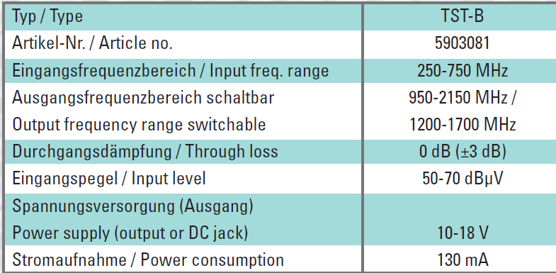 Der Rückumsetzer TST-B setzt das Signal der TST 1200 zurück in den SAT-ZF Bereich und kann bei entsprechender Verteilstruktur z.B. je Etage eingesetzt werden.