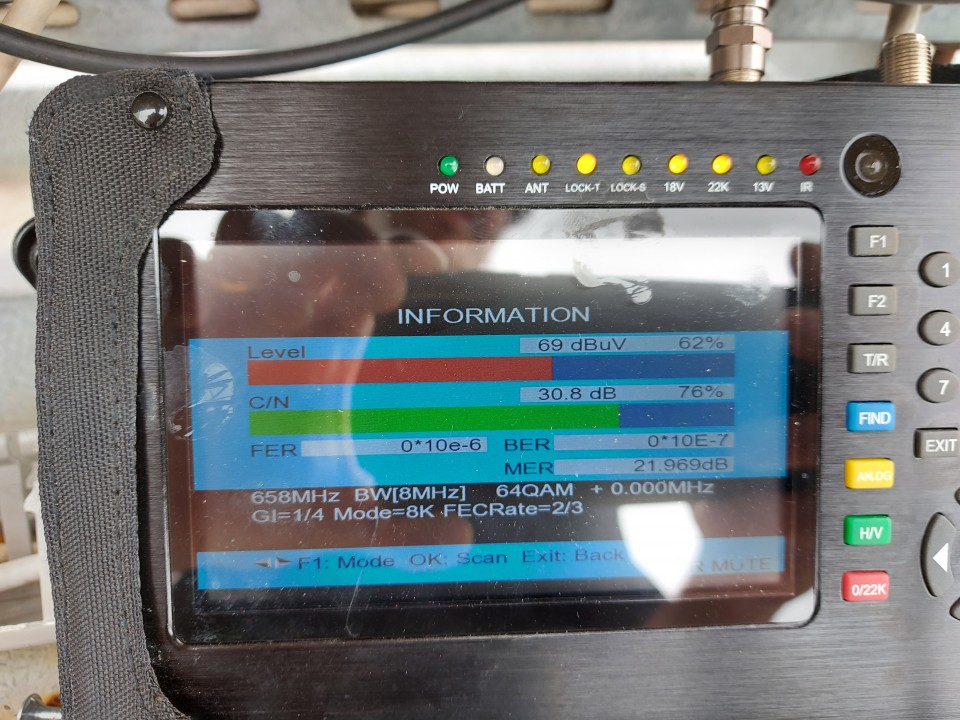 Das Messgerät zeigt 69 dBµV an, also ganz knapp noch im Eingangspegelbereich vom OPM-CON von 67-97 dBµV. Vermutlich kann da der OPM-CON das gar nicht richtig ausregeln ...in dem o.g. Empfangsgebiet finde ich die Sender aus E44 658MZ nicht.
