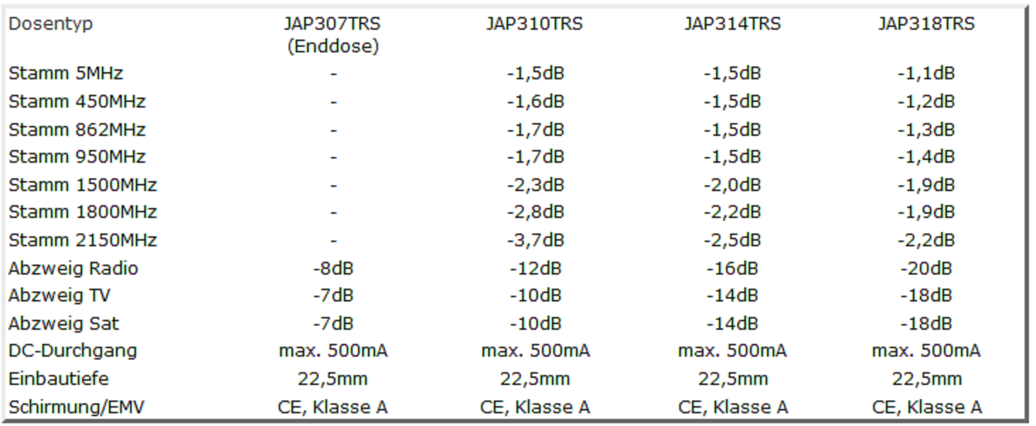 Mit der Serie JAP3xxTRS stehen erstmals Antennensteckdosen zur Verfügung, die den störungsfreien Betrieb teilnehmergesteuerter Einkabelumsetzer auch bei wohnungsübergreifender Installation ermöglichen. Zur Realisierung auch langer Stränge stehen Dosen mit unterschiedlichen Auskoppeldämpfungen (Durchgangsdosen = JAP310TRS, JAP314TRS + JAP318TRS) sowie eine echte, intern terminierte Enddose (=JAP307TRS) zur Verfügung.