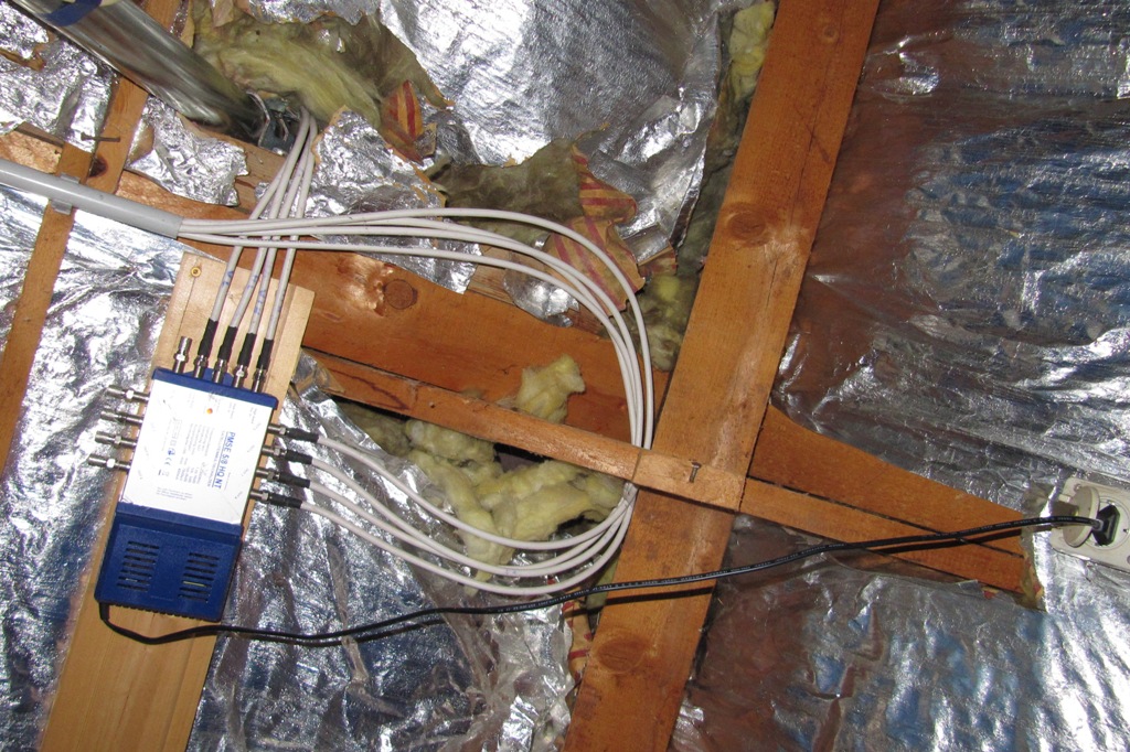 Meine SAT-Anlage stammt noch vom Vorbesitzer, läuft ohne Störungen, wurde aber offensichtlich mit kleinstem Kostenaufwand (siehe Fotos) aufgebaut. Der Multischalter befindet sich über dem Dachgeschoß im Spitzboden, unmittelbar am Antennenmast und versorgt in einer Sternverteilung über drei 14mm Leerrohre, drei Etagen mit je einem Anschluss. Blitzschutz und Potentialausgleich sind, soweit ich es nach einer ersten Begutachtung erkennen kann, nicht vorhanden. Irgendeine Erdung scheint es aber zu geben, denn am Schirm des Koaxialkabels im Erdgeschoß kann ich zur Schutzerde des Stromnetzes einen Durchgangswiderstand von 6 Ohm messen (die angeschlossenen Geräte sollten keinen Schutzleiter haben). Ich muss mir das noch genauer anschauen wenn ich mir eine Atemmaske besorgt habe. Das Dach wurde mit Glaswolle isoliert. Jede Bewegung wirbelt Staub auf, der nach kurzer Zeit einen anhaltenden Hustreiz erzeugt.