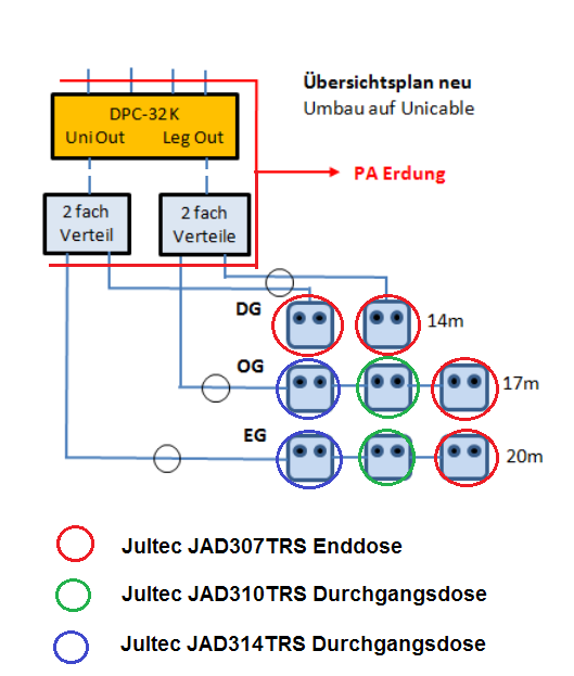 Die zwei Anschlüsse im DG, bleiben unverändert. Das vorhandene Kabel im OG und EG wird heraus gezogen und gleichzeitig damit ein Zugseil eingezogen. Mit dem Zugseil werden je 3 neue Kabel KoaxMini-100-CU eingezogen. Zwei dieser Kabel verlängern sich entsprechend der Position der neuen zusätzlichen Dosen. Das längste Kabel vom Dach bis zum letzten Nebenzimmer im EG ist dann ca. 20 m lang. Das sollte auch mit einer Dämpfung von 10dB (50dB/100m) des 4,3mm Koaxialkabels noch gut gehen.