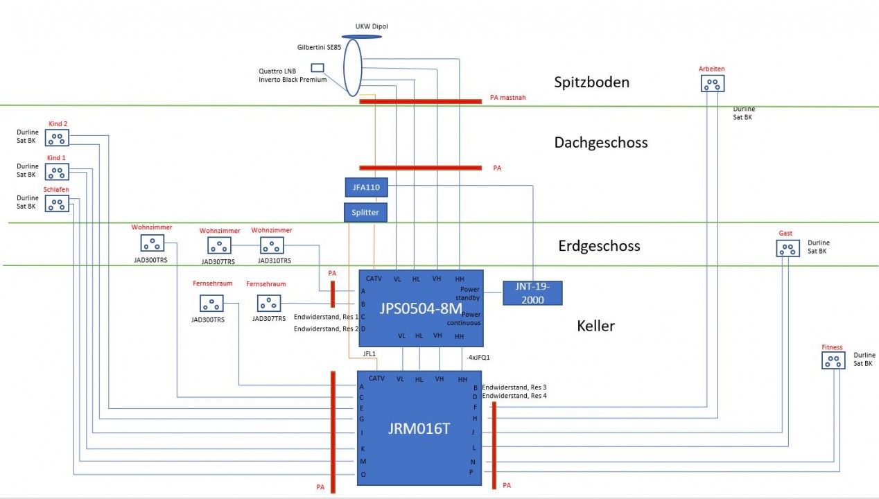 Ein Vorschlag von mir, den habe ich gerade dort noch gesehen ... nehmen sie auch den JRM0516T in der Ausführung JRM0516M, die 4 offenen Kaskadenausgänge von diesem solange nicht verwendet einfach mit einem F-Endwiderstand DC-entkoppelt auch abschließen ... aber so können sie mal irgendwann z.B. eine Sat>IP Versorgung noch zusätzlich mit einbinden.