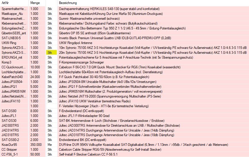 • 25m UV beständiges Sytronic 75100 3-S Hochleistungs Koaxkabel (aufgeteilt auf 5x5m vom Quattro LNB auf den Mast-nahen Potentialausgleich)