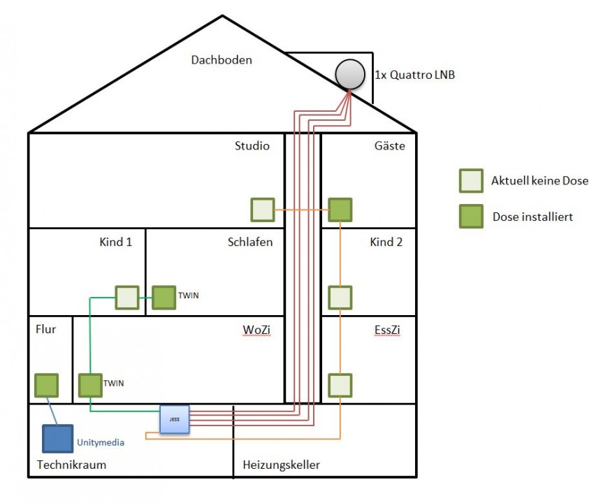Meine Überlegung war den (vermutlich) Twin-LNB gegen einen Quattro zu tauschen, dann vom Dachboden mit vier Kabeln über den (Heizungs-)Versorgungsschacht nach unten in den Technikraum zu fahren. Dort dann ein JESS Multischalter und von dort aus die zwei Stränge wieder nach oben.