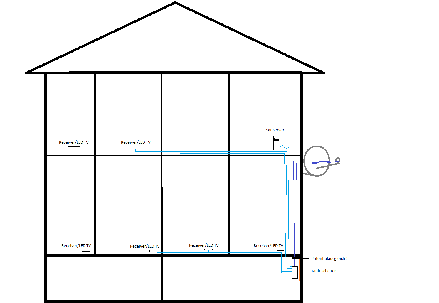 Mehrfamilen-Haus = wohnungsübergreifende Installation ! Damit wird, unabhängig vom Montageort der Antenne (Blitz-geschützer Bereich oder nicht-Blitz-geschützer Bereich) ein Potentialausgleich nach DIN-Vorschrift zur Pflicht =>