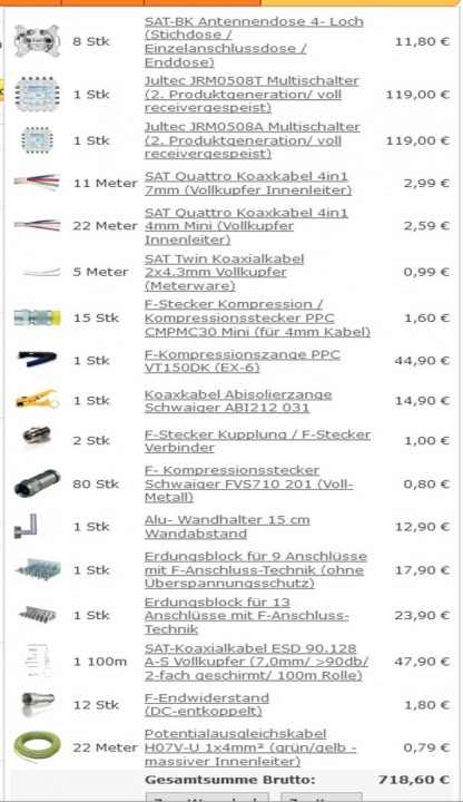Bisher habe ich eine kleine Sat Anlage in Betrieb (80cm Spiegel, Quattro-LNB, Multischalter 5/8, 3 Teilnehmer, Kabellänge bis ca. 30m). Aufgrund anstehendem Umbau und anstehender Abschaltung des Kabelanschlusses, bin ich nun gezwungen Um- und Auszubauen. Ziel ist es, die Antenne entsprechend umzuhängen und 16 Teilnehmer (8x Twin-Receiver) zu versorgen. Terrestrik und UKW wird nicht gebraucht.